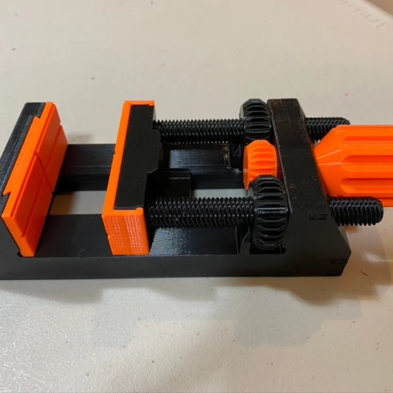 This is a quite robust 3d-printable machine vise. It's 100% 3d-printed - no screw or other piece of hardware is needed to hold the individual pieces together. Pieces clip and snap together.